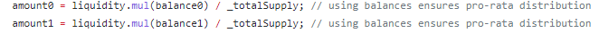 amount1도 이 컨트랙트가 가지고 있는 token1의 양(balnace1) * ((이 사람이 태우는 LP liquidity의 양) / (전체 LP token의 양))(분수) 임 그만큼을 이 사람이 받아감 그 transfer(송금)이 (line 148, 149)에 있음